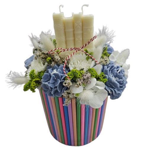Aranjament floral din ceara de soia in suport de creioane cu carte este o creatie unica, realizata manual cu atentie la fiecare detaliu. Acesta combina eleganta florilor sculptate in ceara cu un suport original, decorat cu creioane colorate, care adauga un aer vesel si creativ. Elementul central al aranjamentului este o lumanare in forma de carte, un simbol al cunoasterii, pasiunii pentru lectura si rafinamentului artistic.