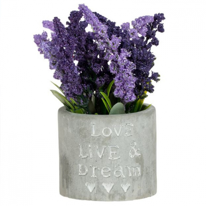 Lavanda artificiala din interiorul ghiveciului adauga un element natural si proaspat, fiind un simbol al relaxarii si calmului. Aceasta floare delicata, cu o culoare violet-purpuriu distinctiva, este realizata din materiale de calitate, astfel incat arata extrem de realist si are o durabilitate foarte buna. Lavanda nu necesita ingrijire, fiind ideala pentru cei care doresc sa aduca un strop de natura in spatiul lor fara a se ocupa de ingrijirea plantelor vii.